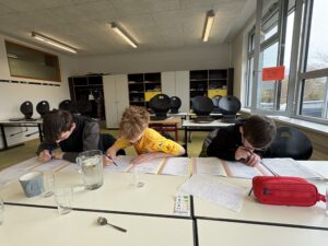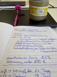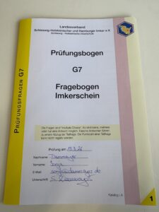 Nach den 6 Online-Schulungen durch Undine kam sie heute zu uns an die Schule und nahm uns nach einer intensiven Wiederholung die Prüfung ab. Da saßen wir 5 also, mit einem Prüfungsbogen wie in der Fahrschule. 7 Themenbereiche wurden bunt gewürfelt abgefragt – von Grundlagen über Bienenbiologie bis hin zu Bienenkrankheiten.