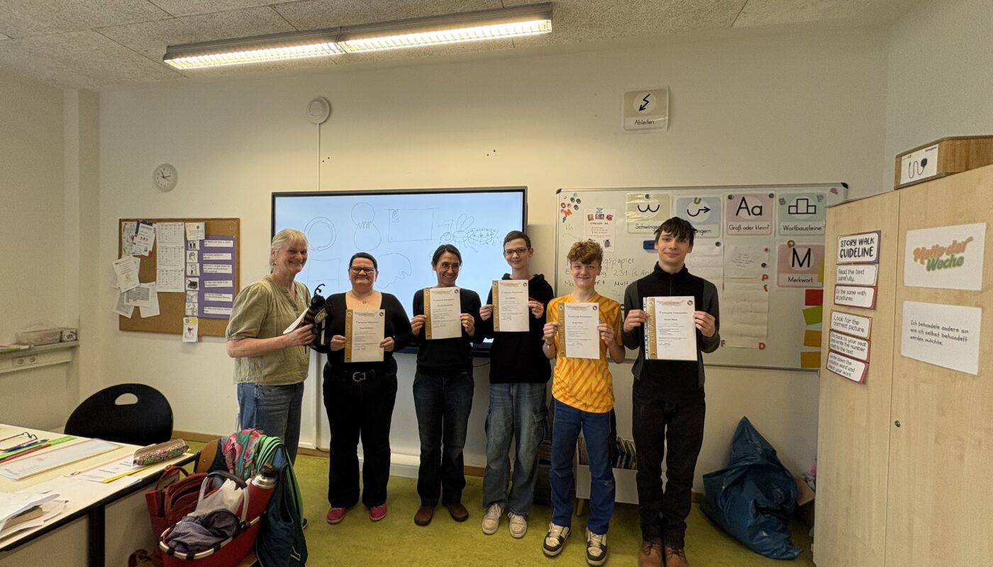 Am Ende durften wir alle unseren Imkerschein in den Händen halten – glücklich und stolz. Das war nun die erste Gruppe, die mit uns an der Schule den Grundkurs absolviert hat und sich nun mit Fachkundenachweis Imker nennen darf. Alle 3 wollen früher oder später selbst Bienen halten. Wir Erwachsenen haben ja schon unsere eigenen…