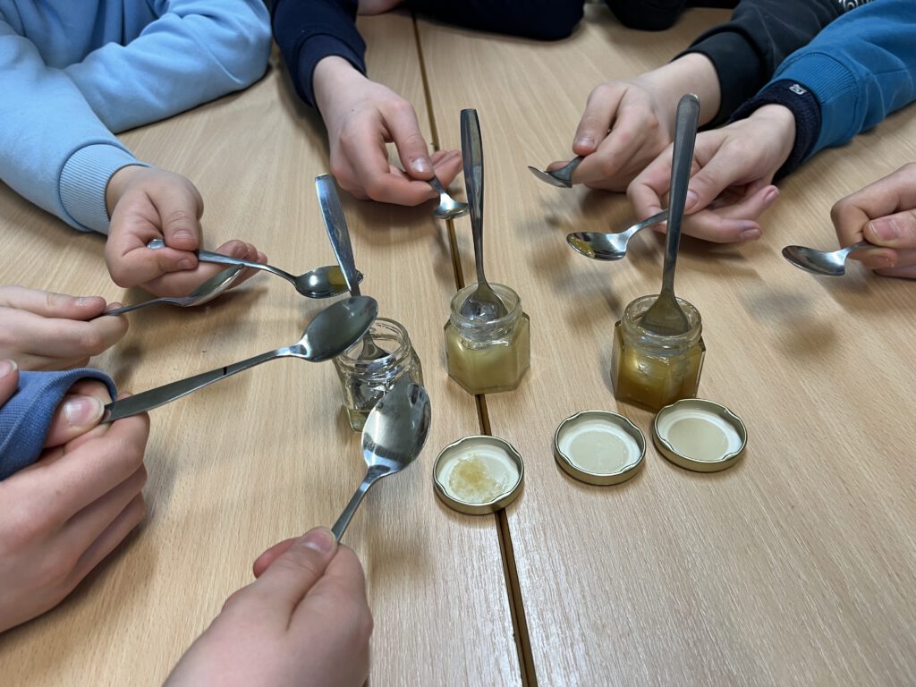 Außerdem verkosteten wir 3 verschiedene Honigsorten und verglichen Konsistenz, Optik und Geschmack. Dabei reifte der Entschluss, demnächst mal zu backen und frische Honigbrote zu essen!