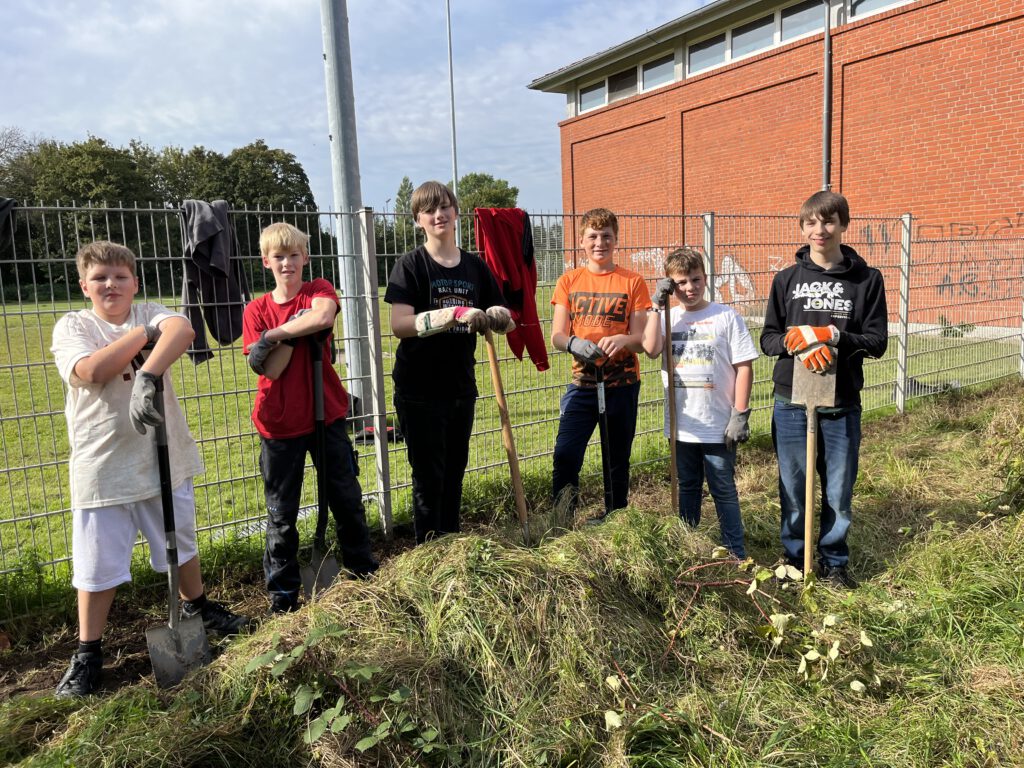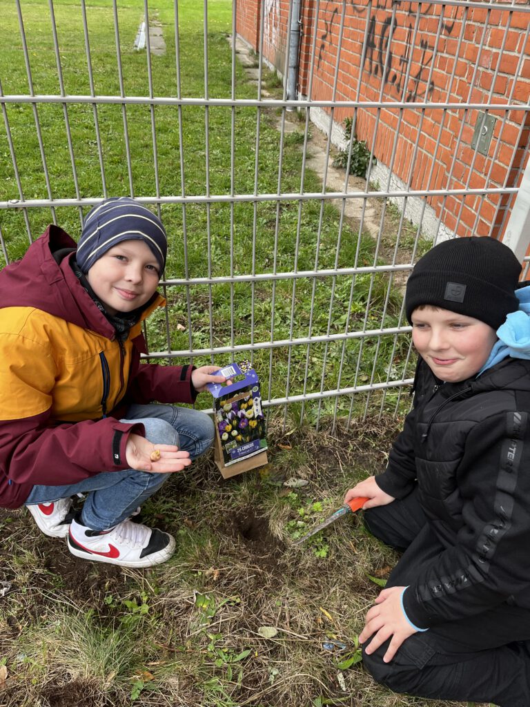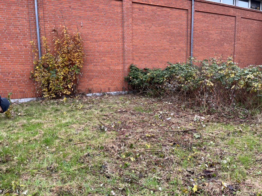 Unsere Hausmeister haben ganze Arbeit geleistet und den von uns ausgesuchten Platz von Brombeeren und Metallschrott befreit. Nun können wir den Boden lockern und Frühblüherzwiebeln setzen, um ein leckeres Bienenbuffet vorzubereiten.