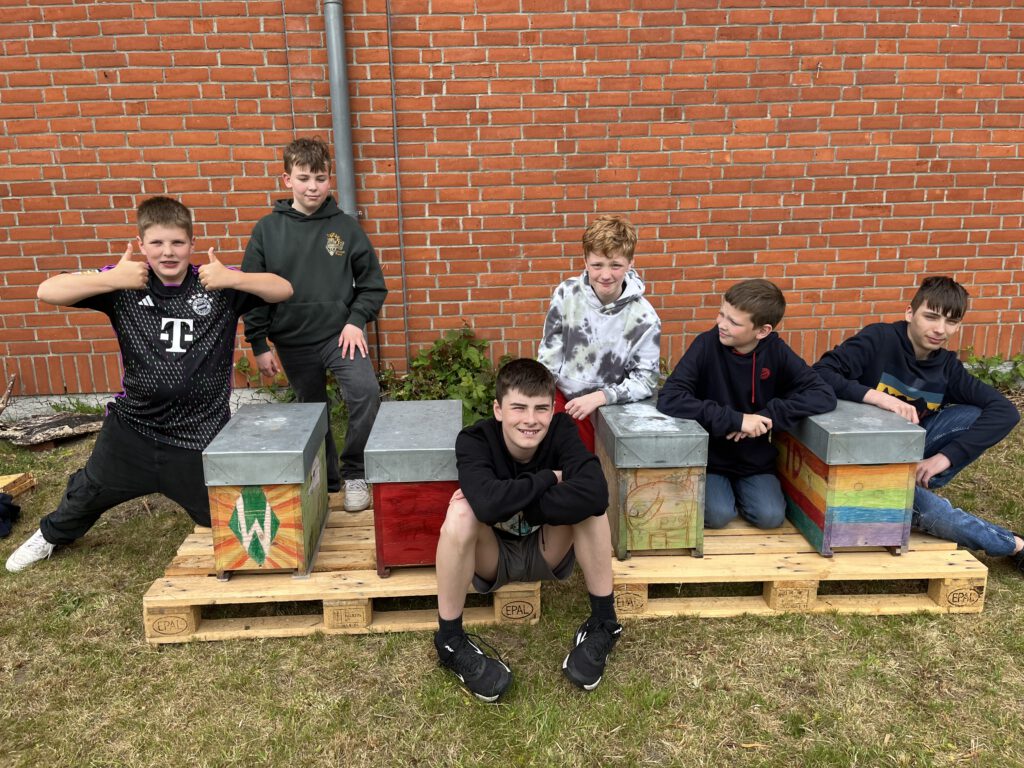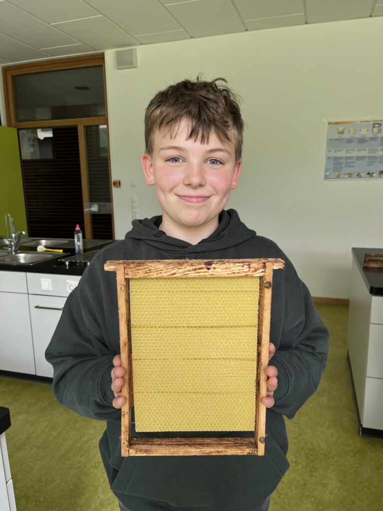 Wir haben den Bienengarten so weit wie möglich vorbereitet, die Beuten mit Rähmchen bestückt. Vorher mussten wir aber noch die Mittelwände einlöten. Nun fehlen noch die Bewohner, diese sind bereits bei Frau Moro-Richter im Keller und sollen morgen einziehen. Gerüchteweise haben wir nun 33.000 neue Schultiere…