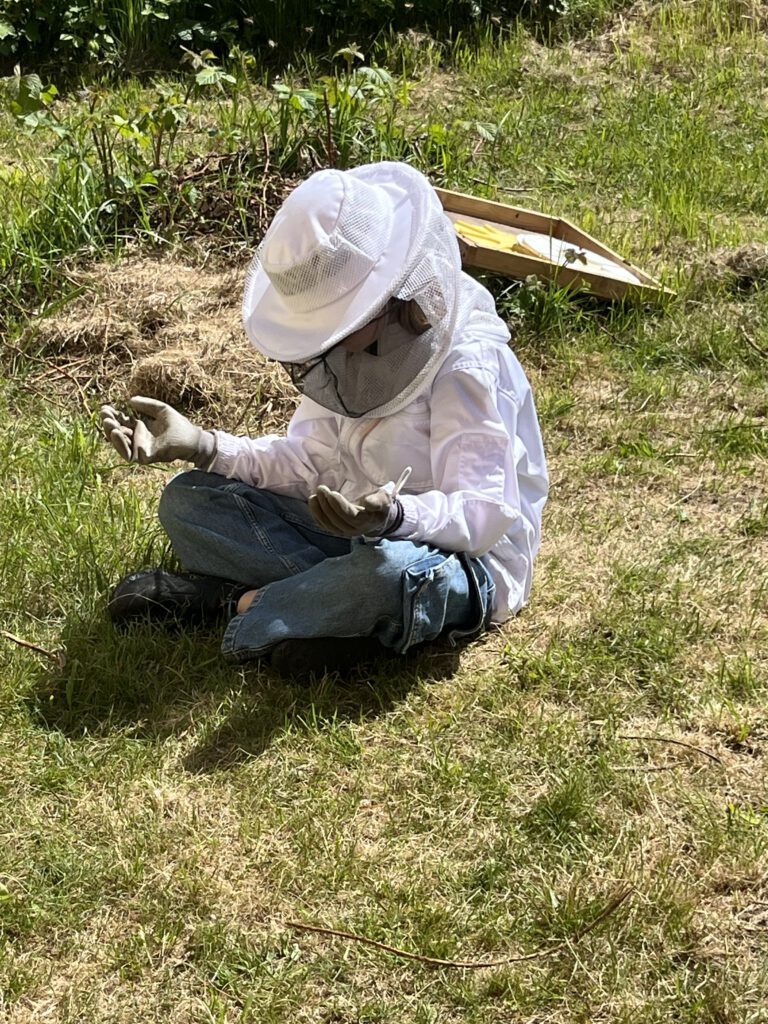 Ach ja, und dann war da noch die Perfektion im meditativen Imkern: eine Bienen-Meditation inmitten der schwirrenden Völker. Alles friedlich, kein Stich, nix. Und ein tiefenentspanntes Kind mittendrin.