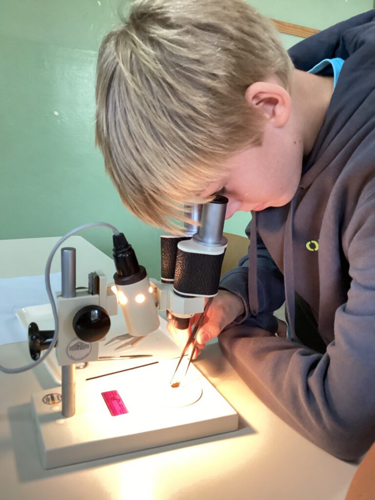 Da wir hier ja im Norden nicht immer mit Sonne, trockener Luft und Windstille gesegnet sind, gibt es auch AG-Tage die drinnen stattfinden müssen. Und da lässt sich gerade vor allem meine Kollegin ordentlich was einfallen. Als Nawi-Lehrerin und absolute Koryphäe (zumindest im Vergleich zu mir mit meinen 2 braunen Daumen) ist sie gerade meine Heldin und leitet die Gruppe an, sich die Arbeiterinnen und Drohnen unter dem Binokular genauer anzusehen.